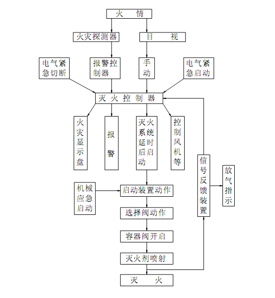 5.3.1 系統(tǒng)的啟動方式為自動控制、手動控制和機械應急手動控制三種。一般情況下應使用手動控制,在保護區(qū)無人的情況下可以轉換為自動控制,當自動控制和手動控制不能執(zhí)行時,應采用機械應急手動控制。