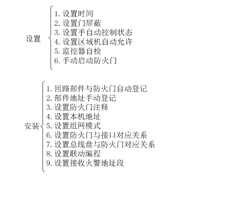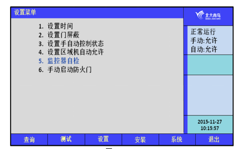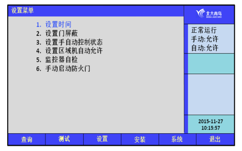 在設(shè)置操作菜單中可以進(jìn)行如下操作:設(shè)置時(shí)間、設(shè)置門屏蔽、設(shè)置手自動(dòng)控制狀態(tài)、設(shè)置區(qū)域機(jī)自動(dòng)允許、監(jiān)控器自檢、手動(dòng)啟動(dòng)防火門。