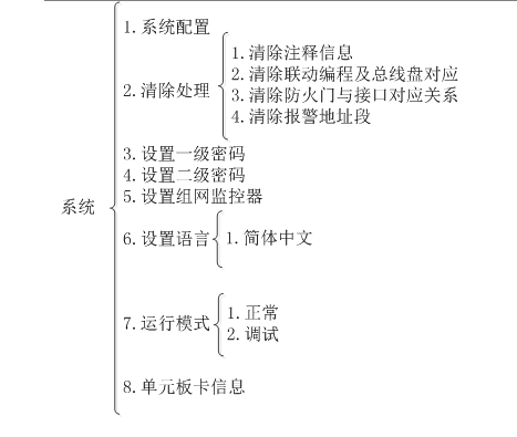 JBF-61S20防火門監(jiān)控器使用分層化菜單管理模式。用戶在使用時(shí)會(huì)感到更具有條理、操作思路清晰等優(yōu)點(diǎn)。同時(shí),為了避免嵌入式菜單不能在同一界面中完全顯示這一問題的出現(xiàn)給用戶帶來的不便,監(jiān)控器使用說明給出系統(tǒng)控制功能菜單的完全拓?fù)浣Y(jié)構(gòu)圖,如下所示。用戶在使用時(shí),可以從該拓?fù)鋱D中找到需要使用的功能所在操作菜單的具體位置,以及選擇該圖操作的正確路徑,達(dá)到方便快捷操作本系統(tǒng)的效果。在使用時(shí),如跟隨屏幕提示操作仍有疑問,可以根據(jù)菜單拓?fù)鋱D和目錄在本章節(jié)中找到對(duì)應(yīng)部分的詳細(xì)說明講解。