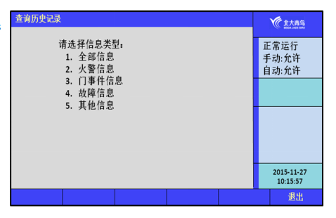 通過此菜單可以查詢到:1、全部信息;2、火警信息;3、門事件信息;4、故障信息;5、其他信息;通過操作數(shù)字鍵1~5選擇所需查詢的信息類型。