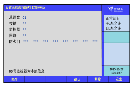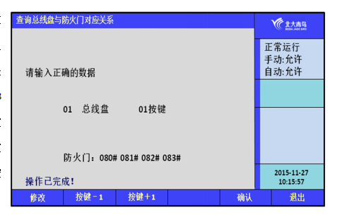 通過鍵入**號(hào)按鍵與對(duì)應(yīng)的防火門,配置總線盤上按鍵與防火門的對(duì)應(yīng)關(guān)系,每個(gè)按鍵最多可以對(duì)應(yīng)8個(gè)防火門。通過【修改】鍵可以進(jìn)行修改,【確認(rèn)】鍵完成配置。