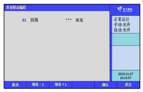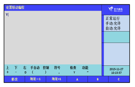 進(jìn)入“設(shè)置”選項(xiàng),選擇“設(shè)置聯(lián)動(dòng)編程”提示符“Y(”出現(xiàn),可在提示符后面輸入聯(lián)動(dòng)邏輯編程語(yǔ)句。輸入完畢后,按“確認(rèn)”鍵,若提示編程正確,可進(jìn)行下一條語(yǔ)句;若提示錯(cuò)誤,需重新輸入編程語(yǔ)句;可按“<”鍵修改,或按“修改”鍵重新輸入。