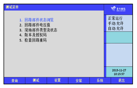 進(jìn)入測(cè)試選項(xiàng)菜單,如圖7.2,在此菜單中你可以查詢到以下信息:回路部件狀態(tài)瀏覽、回路部件電壓值、現(xiàn)場(chǎng)部件類型狀態(tài)、版本及授權(quán)碼以及檢查回路重碼。