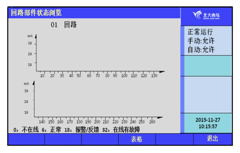 回路部件狀態(tài)瀏覽的測(cè)試界面如下圖,可以瀏覽252個(gè)現(xiàn)場(chǎng)部件的狀態(tài)信號(hào)電流值,并可通過選擇轉(zhuǎn)換為表格顯示方式。橫向代表不同地址的現(xiàn)場(chǎng)部件,縱向代表電流值。