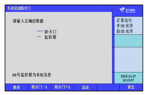 確認(rèn)防火門地址號(hào)無誤后按【啟動(dòng)】鍵啟動(dòng)設(shè)備。如果輸入的防火門地址號(hào)有誤,按【修改】鍵后重新輸入。這個(gè)操作也是在手動(dòng)允許的狀態(tài)下,才可以使用。組網(wǎng)中的集中機(jī)可以啟動(dòng)區(qū)域機(jī)的防火門。