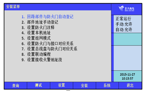 在安裝操作菜單中可以執(zhí)行以下操作:回路部件與防火門自動(dòng)登記、部件地址手動(dòng)登記、設(shè)置防火門注釋、設(shè)置本機(jī)地址、設(shè)置防火門與接口對(duì)應(yīng)關(guān)系、設(shè)置總線盤與防火門對(duì)應(yīng)關(guān)系、設(shè)置聯(lián)動(dòng)編程、設(shè)置接收火警地址段。如圖7.4所示。