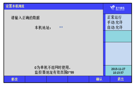 通過此菜單可以對(duì)本機(jī)的地址進(jìn)行設(shè)置,單機(jī)不組網(wǎng)時(shí)使用地址0,監(jiān)控器有效地址范圍是0~99。