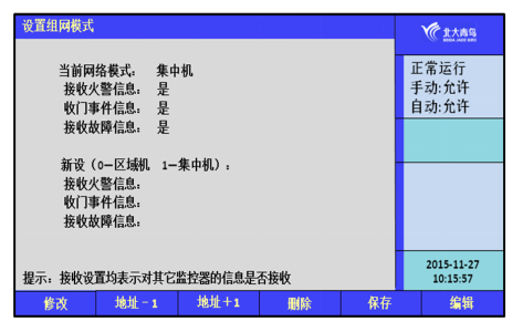 防火門的組網(wǎng)形式有:0—區(qū)域機(jī),1—集中機(jī)。當(dāng)設(shè)置為集中機(jī)的時(shí)候,可以選擇是否接收火警信息、門事件信息以及故障信息;如果設(shè)置成區(qū)域機(jī),不接收其他防火門監(jiān)控器的事件,僅接收其他控制器(包括防火門監(jiān)控器和報(bào)警主機(jī))的報(bào)警消息,且受報(bào)警地址段的控制。