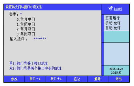 防火門的類型分為四種:0.常開單門,1.常閉單門,2.常開雙門,3.常閉雙門。根據(jù)需要選擇對(duì)應(yīng)的類型,并對(duì)應(yīng)相應(yīng)的接口,實(shí)現(xiàn)防火門與接口的對(duì)應(yīng)關(guān)系。常開防火門對(duì)應(yīng)輸入/輸出接口,常閉防火門對(duì)應(yīng)輸入接口。