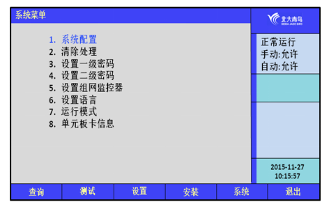 在系統(tǒng)操作菜單中可以執(zhí)行以下操作:系統(tǒng)配置、清除處理、設(shè)置一級(jí)密碼、設(shè)置二級(jí)密碼、設(shè)置語(yǔ)言、運(yùn)行模式、單元板卡信息。見 7.5所示