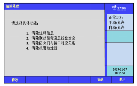 通過清除操作可以清除監(jiān)控器中已經(jīng)設(shè)置的信息,包括注釋信息、聯(lián)動(dòng)編程及總線盤對(duì)應(yīng)、防火門與接口對(duì)應(yīng)關(guān)系和報(bào)警地址段的清除。如圖7.5.2所示。一旦刪除無法恢復(fù),謹(jǐn)慎使用。