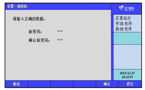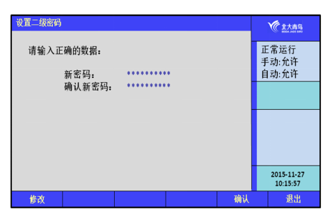 通過此菜單修改一級(jí)用戶密碼。在“設(shè)置密碼”處輸入修改后的密碼,在“檢驗(yàn)密碼”處再重新輸入一次進(jìn)行檢驗(yàn),按面板上的【F5】確認(rèn)修改或按【F1】修改。