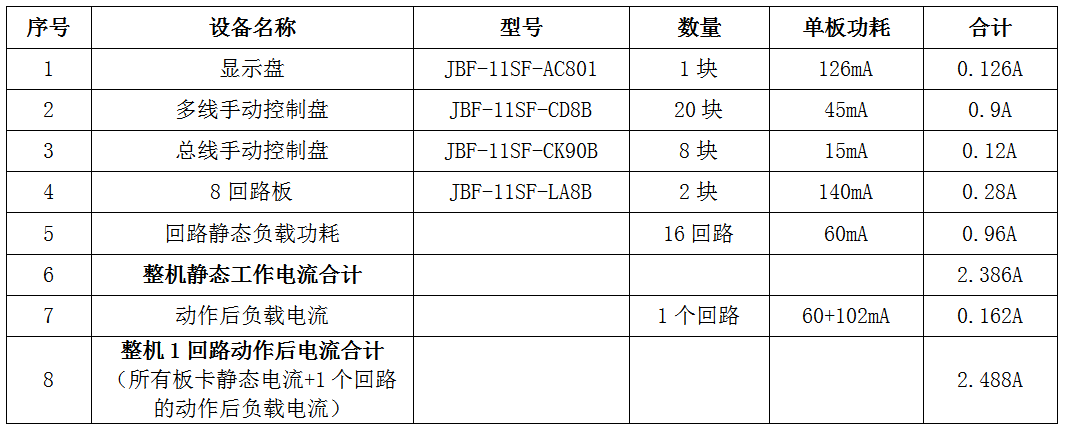 通過以上計(jì)算得知,JBF-11SF控制器(16回路)整機(jī)在靜態(tài)待機(jī)工作時(shí)的電流值為2.386A,在某1回路設(shè)備動作后(國標(biāo)要求不少于50只),整機(jī)工作電流2.488A,控制器標(biāo)配系統(tǒng)電源最大輸出電流10A,完全滿足本機(jī)工作需求。