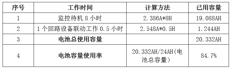 通過以上計(jì)算得知,控制器備用電池在待機(jī)8小時(shí)后某1回路設(shè)備動作后(國標(biāo)要求不少于50只)持續(xù)工作0.5小時(shí),電池容量的總使用率為84.7%。因此控制器標(biāo)配24AH備用電池容量完全滿足國標(biāo)要求。