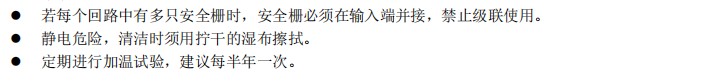 ?•使用時(shí)必須配接安全柵,每只安全柵后所帶防爆型感溫探測(cè)器《10只,每個(gè)報(bào)警回路使用安全柵?的數(shù)量不得超過(guò)6只。