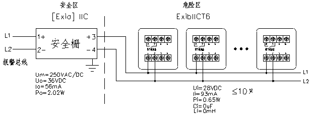 使用時(shí)必須配接安全柵,每只安全柵后所帶防爆型手動(dòng)報(bào)警按鈕≤10只,每個(gè)報(bào)警回路使用安全柵的數(shù)量不得超過6只。