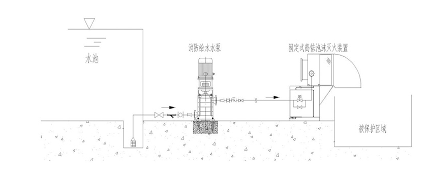 固定式高倍數(shù)泡沫滅火系統(tǒng)示意圖: