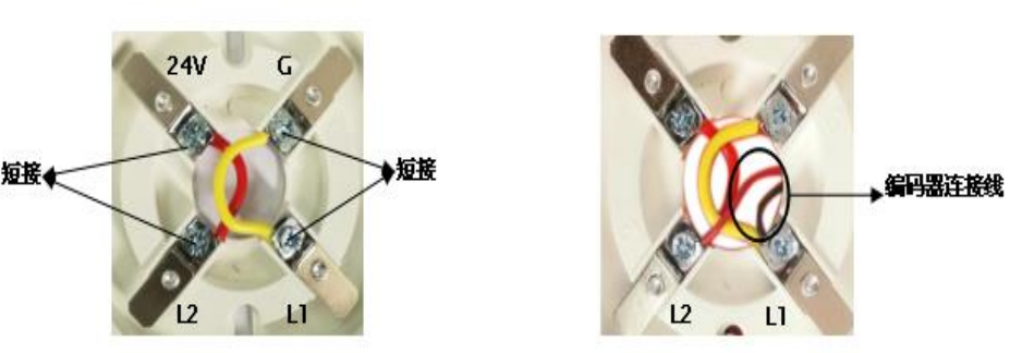 ? 在編寫地址前需要將探測器安裝底座上的 24V 與L2 端子短接,G 與L1 端子短接,編碼器連接線分別接