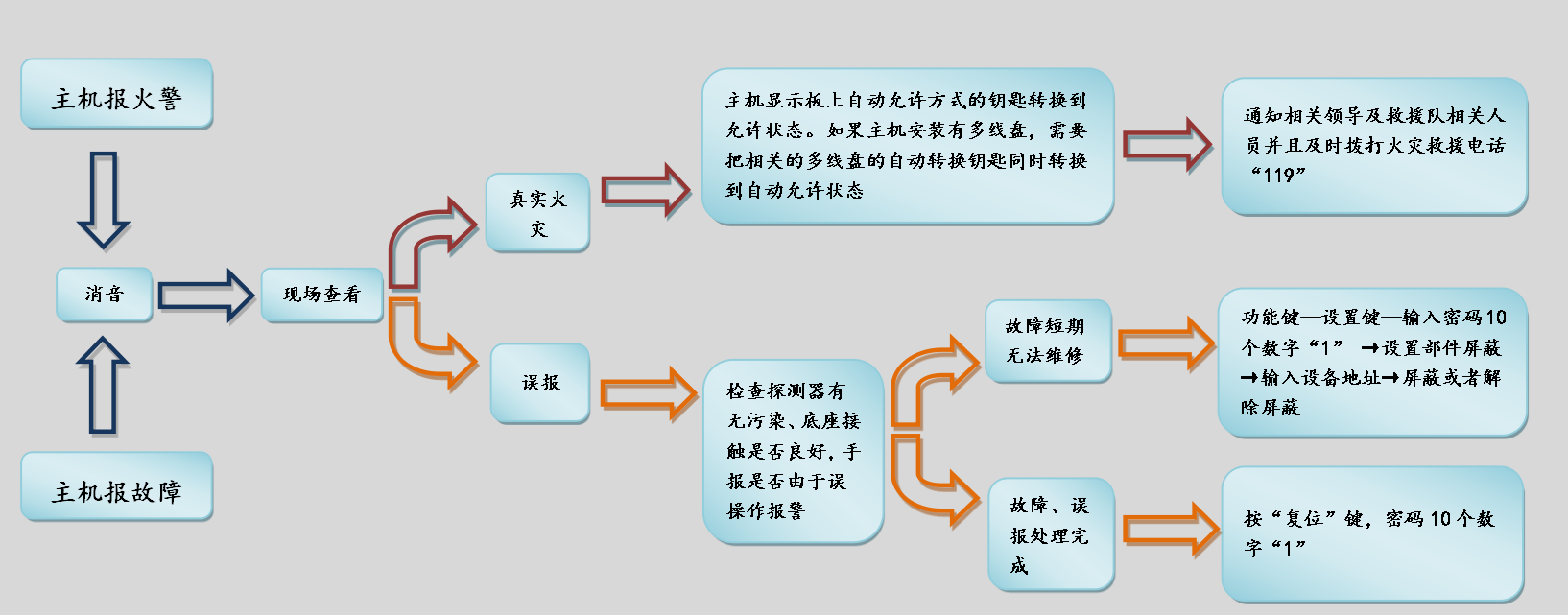 檢查探測(cè)器有無污染、底座接觸是否良好,手報(bào)是否由于誤操作報(bào)警。按照流程圖修復(fù)相關(guān)故障。